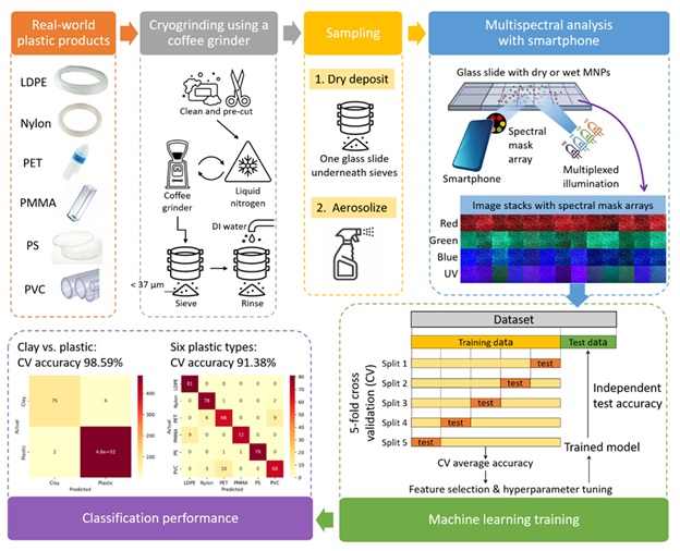 Under this goal, we will develop biosensors enabled by nanotechnology that can provide accurate, reliable, cost-effective, onsite, and rapid detection of a broad range of target entities that are relevant to agriculture, food, and environmental systems. The group members will utilize many different physical, chemical, and biological means to create biosensors that can meet various needs. The signal transduction methods we will explore include electrochemical, optical/photonic, gravitational, acoustic, spectroscopic, thermal, etc. We will create different types of nanomaterials and nanostructures, including metallic nanoparticles and structures, bendable and wearable graphene substrates, carbon nanotubes, inorganic and organic nanoparticles, etc., and develop strategies to form nanomaterials-bioconjugate composites to serve as nanoprobes that will enhance the performance of biosensors. The group members will also explore various types of biosensor setups, including lab-in-a-tube, microfluidic microchip, portable sensor, etc., to facilitate easy deployment of the biosensors for onsite and in-field applications, and develop smartphone-based readout and data analytics that support high throughput and fast data generation and interpretation. An example of a smartphone-based microfluidic biosensor developed by Dr. Yoon (AZ) to detect micro- and nano-plastics in water is shown in Fig. 1. It also shows how data analytics will be incorporated with the biosensor. In a nutshell, we aim to develop methods and tools that can be easily adopted and used by everyday users to serve our stakeholders.